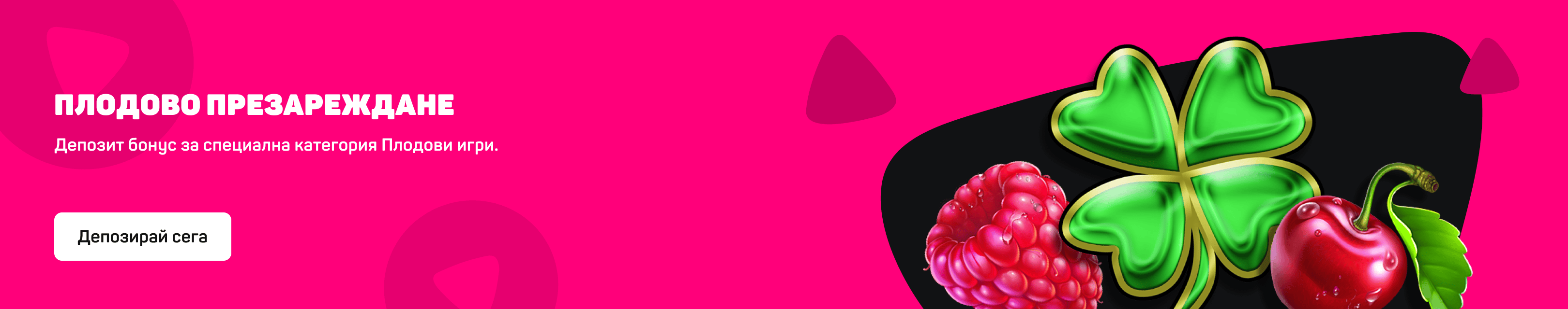 Тази промоция е ексклузивна за всички класиращи се играчи, поканени да участват чрез имейл или смс съобщение. Промоцията се провежда всеки вторник за периода от 10.02.2026 до 30.05.2026 година включително. Минималната сума на депозит, класираща се за Плодово Презареждане е в размер на €10. Всички класиращи се участници, получават Плодово Презареждане в размер на 50% до €55, като информация за това се предоставя чрез получено съобщение в меню Съобщения. Всеки класиращ се участник може да активира Плодово Презареждане по желание от меню Бонуси след извършването на класиращ се депозит. За получаване на максималната сума бонус средства за всяка една бонус оферта се изисква депозит на стойност, както следва: Плодово Презареждане 50% до €55: €110 депозит за максимална сума на бонус средствата в размер на €55 Бонусът се кредитира автоматично в рамките на 1 час след извършването на депозит. Предоставения депозит бонус е Неограничаващ Бонус. Залози се поставят първо със средства от кеш баланса на участника. След изразходването им, бонусът се активира. Условията описани по-долу се прилагат, единствено за залозите направени с бонус средства и/или получените печалби от безплатни завъртания. Изискванията за отиграване започват в момента, в който предоставяният бонус се активира и се извърши залог с бонус средства. Бонус средствата трябва да бъдат отиграни 35х (тридесет и пет пъти) преди да бъдат превърнати в истински пари. Бонус средствата от настоящата промоция, могат да се използват за поставяне на залози само на посочените игри в категория Плодово Презареждане. Включените игри са както следва: